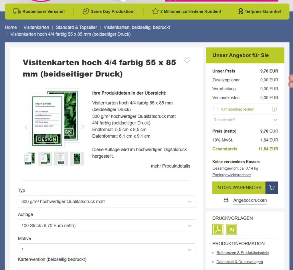 Den günstigsten Preis für 100 Visitenkarten bietet Wir-machen-druck mit 11,54 Euro. Dieser Preis ist 2026 übrigens der gleiche wie er es vor etwa 1,5 Jahren war. Ebenfalls erwähnenswert: Ein Upgrade auf ein dickeres Papier mit 350 g/m² kostet hierbei nur wenige Cent und ist daher sehr empfehlenswert!